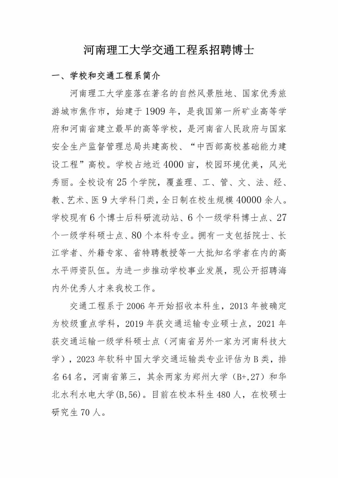 河南理工大学交通工程系招聘博士